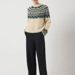 Capture the essence of autumn with our range of autumnal pieces in rich colours and charming silhouettes. Combine different textures and prints to create a layered look. Featuring a round neck, cuffed sleeves and a rich green colour, this knit will soon become a staple in your autumn winter wardrobe. Featuring 30% RWS Wool, 22% Polyester, 16% Nylon, 16% Alpaca Wool, 13% Acrylic, 3% Elastane, this knit will keep you cosy these colder months.