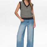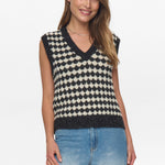 This chic knitted vest features a classic diamond pattern in black and cream for a timeless look. Designed with a flattering V-neckline and soft, textured yarn, it’s perfect for layering over shirts or dresses. Add effortless style and cozy comfort to your everyday outfits with this versatile wardrobe staple.