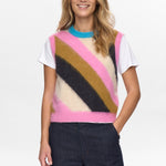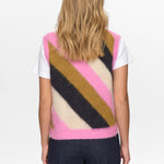 Add a pop of colour to your winter wardrobe with this cosy, retro-inspired sweater vest. Featuring bold diagonal stripes in pink, mustard, cream, and black, and finished with a contrasting turquoise neckline, it’s perfect for layering over your favourite tees or shirts. Soft, fluffy texture meets playful design for a statement look that keeps you warm and stylish all season long.