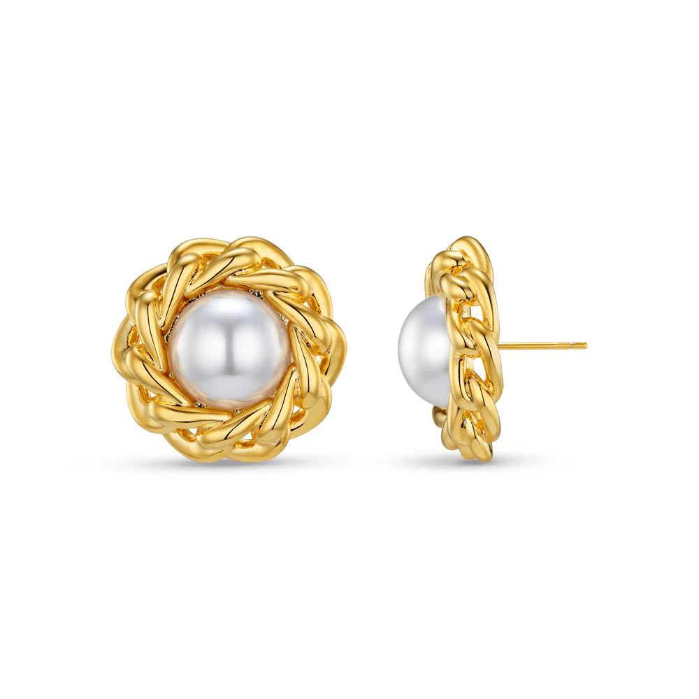 Reinvent classic elegance with these Statement Pearl & Chain Stud Earrings. Featuring radiant pearls intertwined with a textured chain setting. These studs create an unexpected fusion of softness and strength.