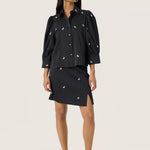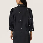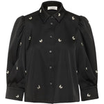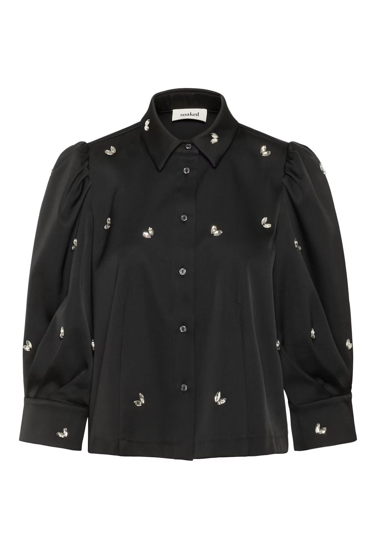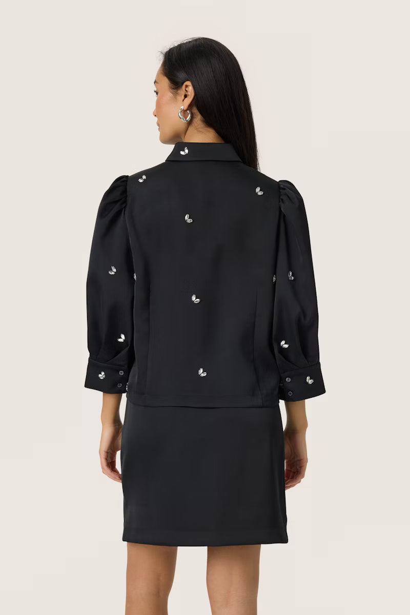 Add a bit of sparkle to your winter wardrobe with our Selda Chiba Shirt. Black shirt with decorative stones and voluminous sleeves. A feminine design with elegant detailing and a relaxed fit. Style it solo or with the matching skirt for a complete look. The model is wearing a size M.