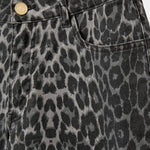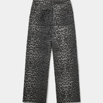 Make a bold statement with these high-waisted jeans featuring a monochromatic grey leopard print. Crafted with a relaxed, wide-leg silhouette and classic five-pocket styling, they offer the perfect blend of edgy pattern and effortless comfort.